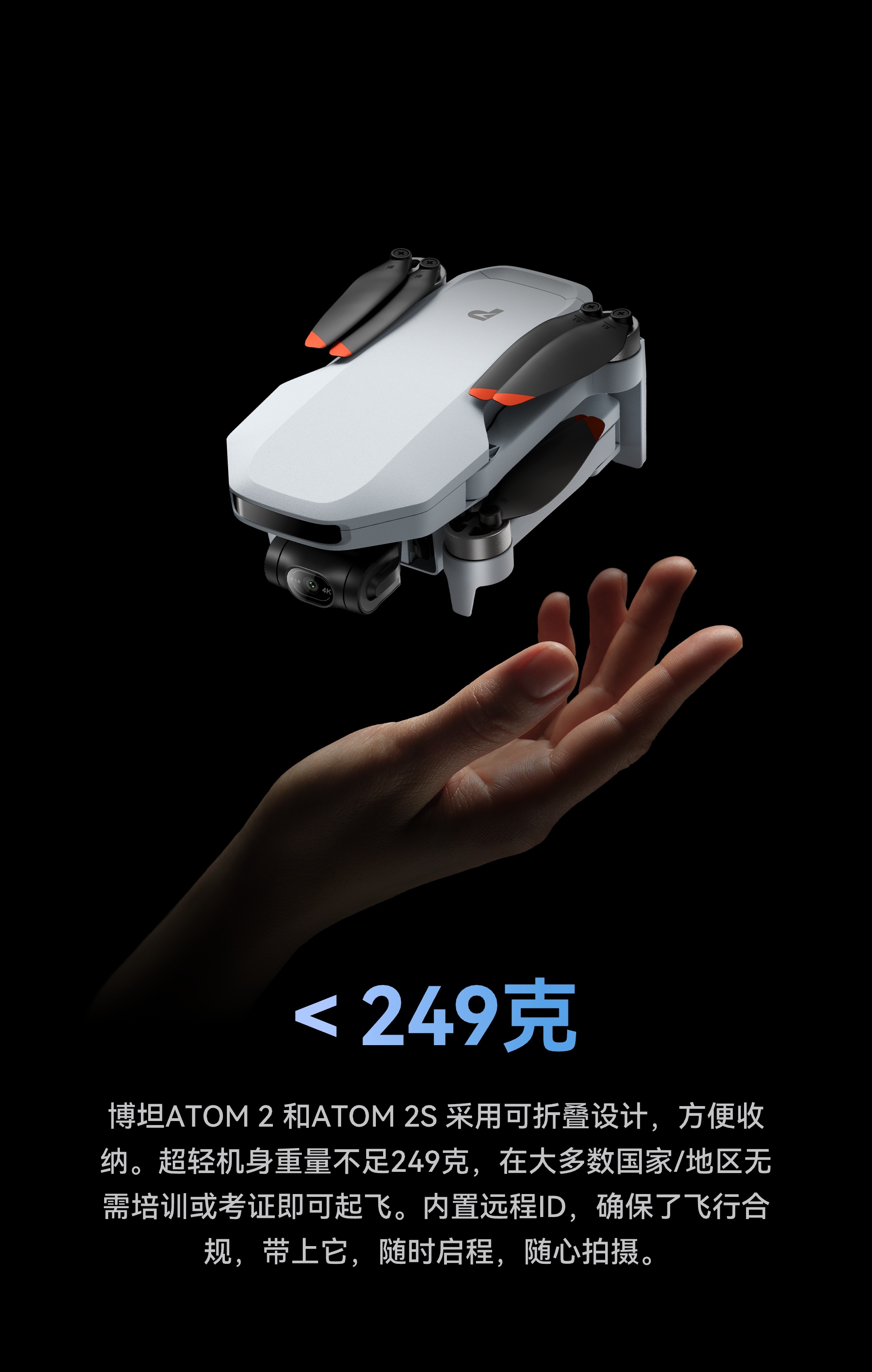 XMR/C M18 采用可折叠设计,方便收纳。超轻机身重量低于249克,在大多数国家/地区无需培训或考证即可起飞。