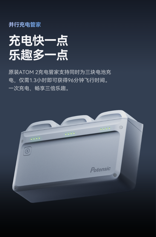 原装ATOM系列充电管家支持同时为三块电池充电,仅需1.3小时即可获得96分钟飞行时间。一次充电,畅享三倍乐趣。